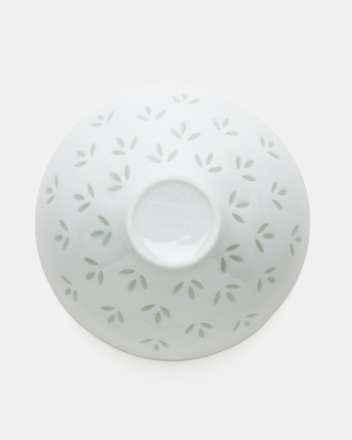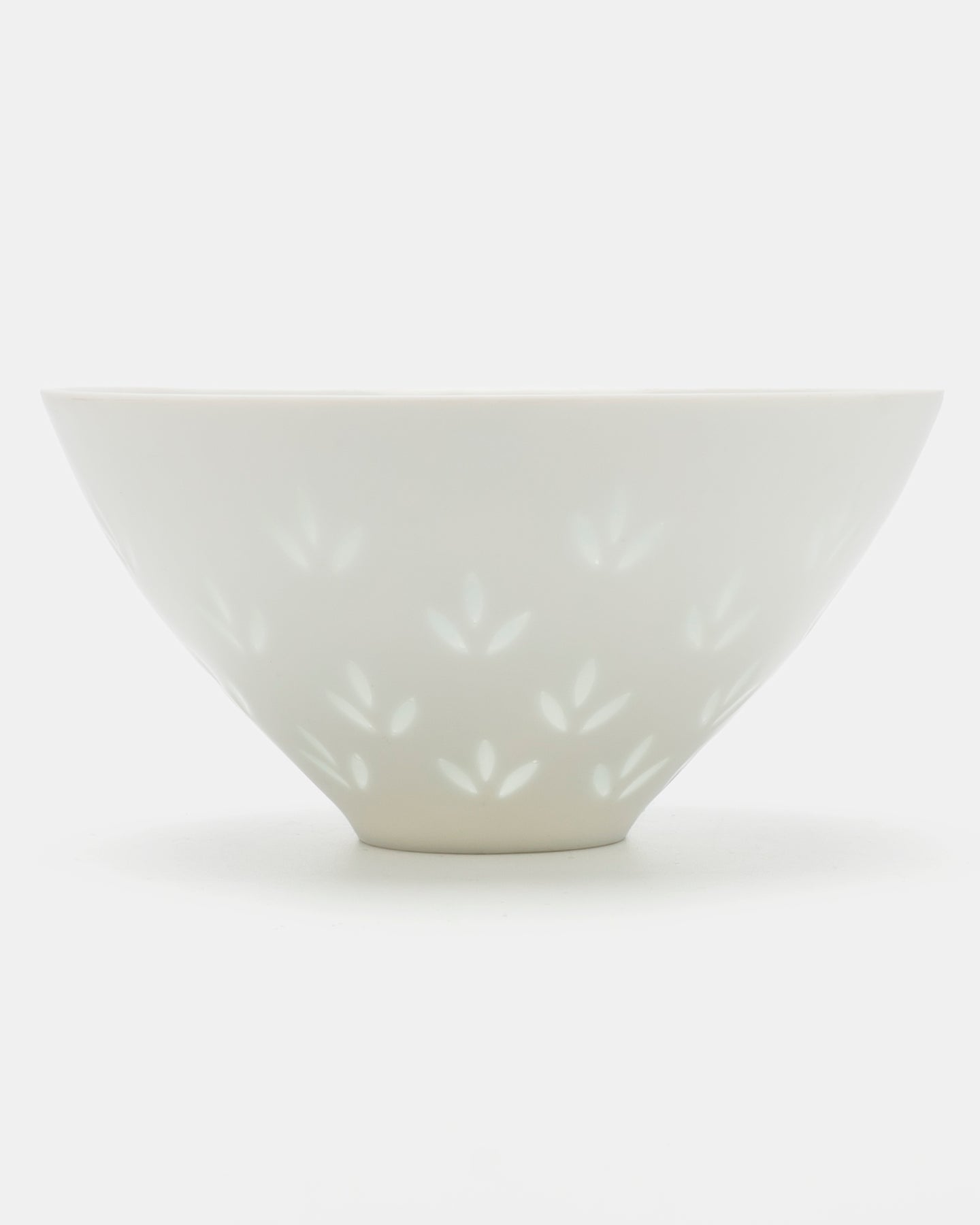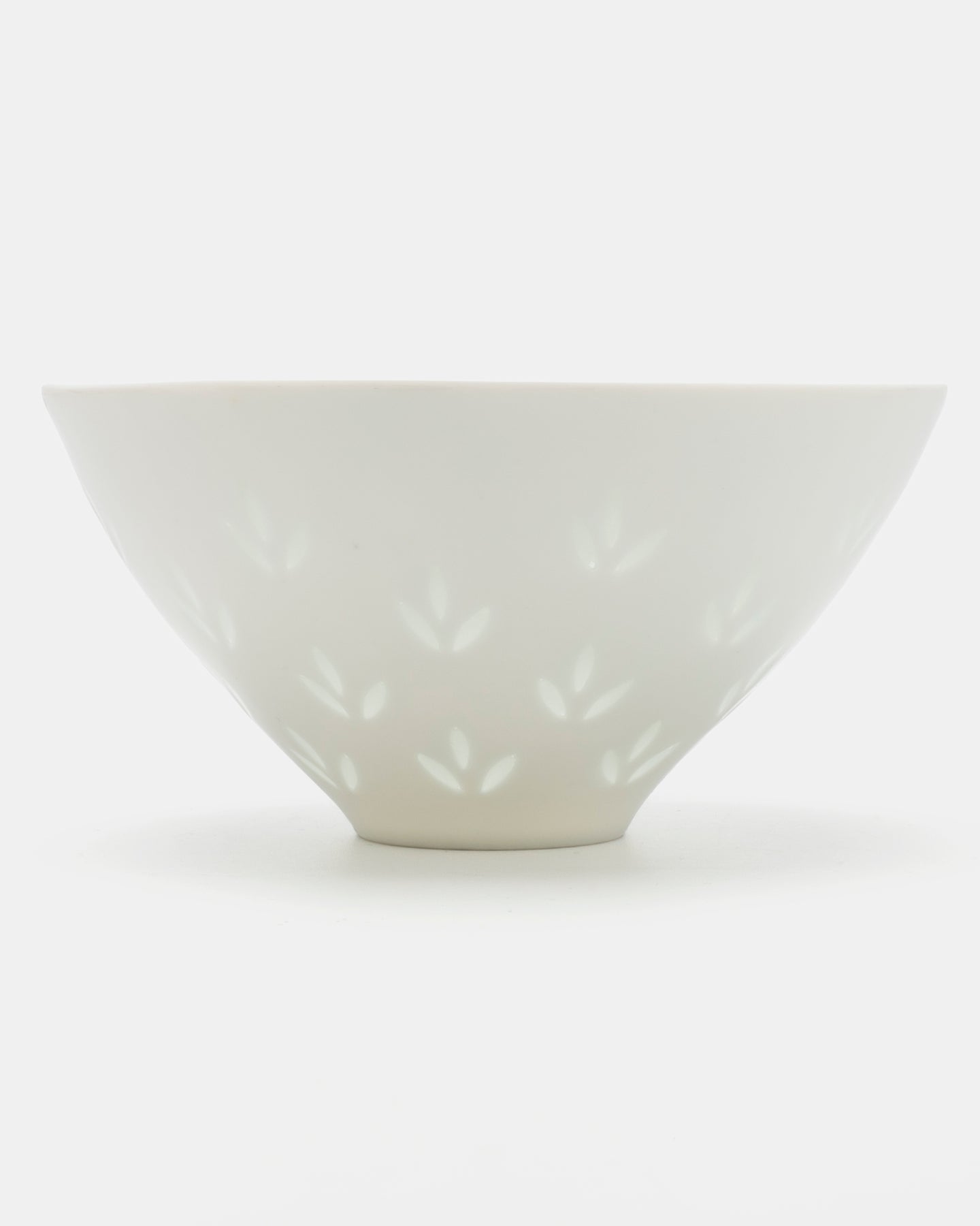 透かし文様は職人の手により一つひとつ特殊なナイフでカットされ、その後に800°で素焼き、釉薬をかけ1380°で再び焼成することによりカットされた部分はガラス質となり光を通して透かしの文様が浮かび上がります。