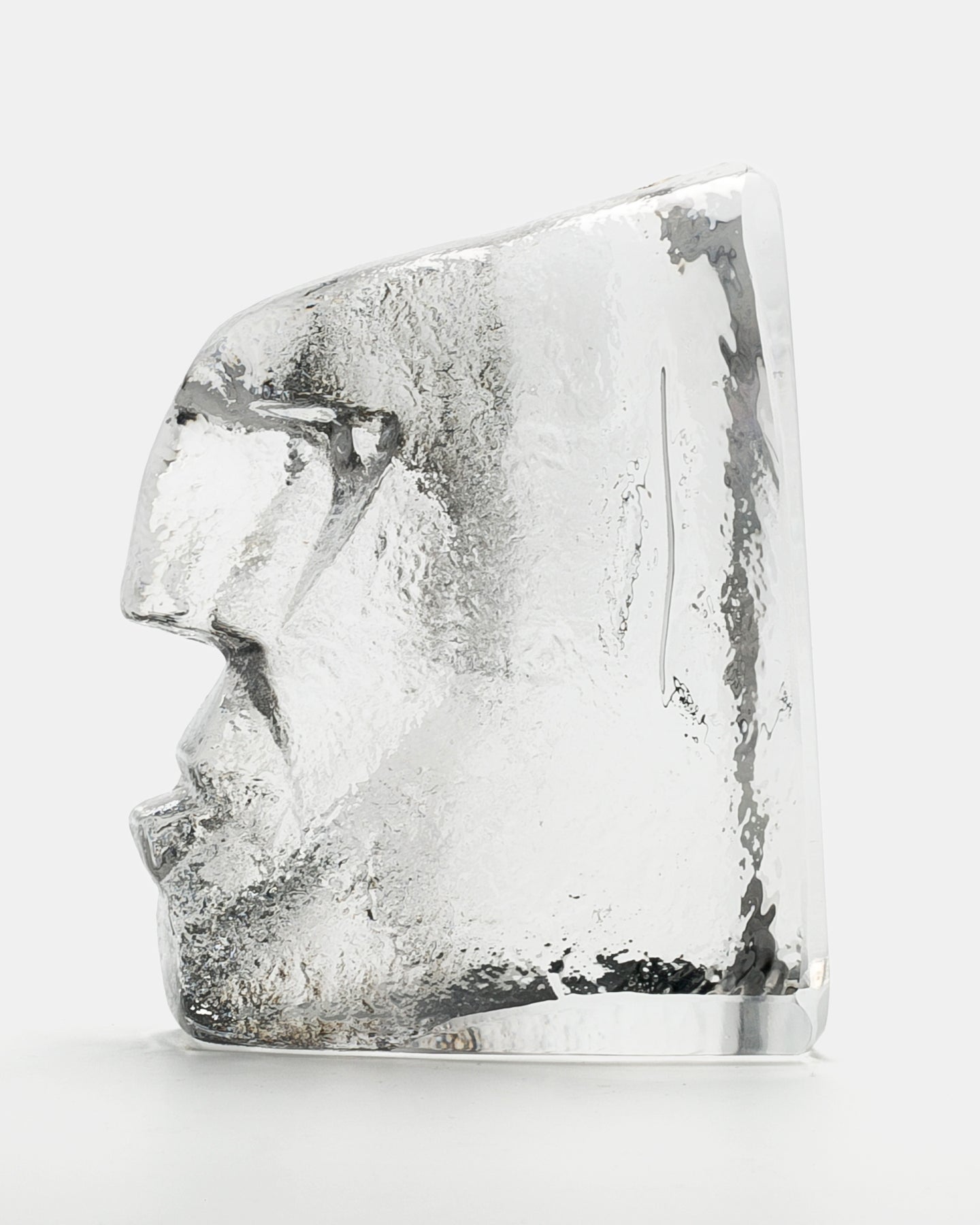 単純化された造形と彫刻的なフォルムは古代文明の石像にも通じる象徴性を示し、ガラスでありながら彫刻作品のような存在感を生み出しています。